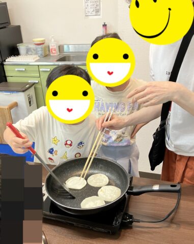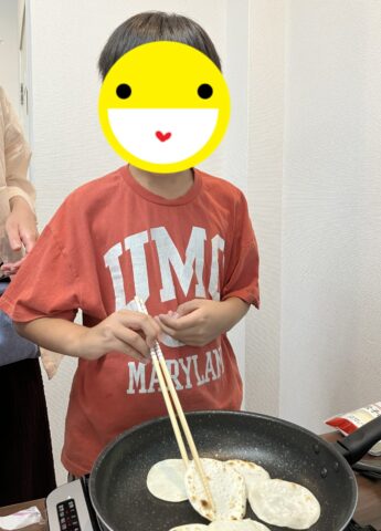 フライ返しで餃子の皮をひっくり返したり、チョコソースをかけたりと楽しみながら安全に調理をすることができました。