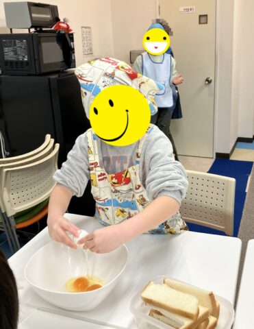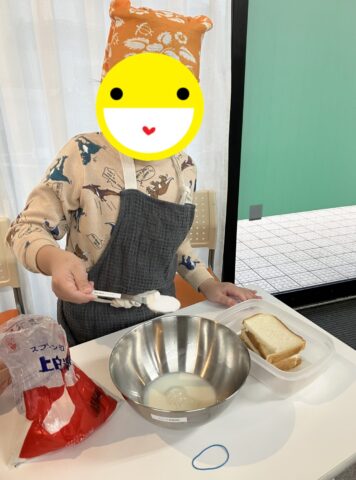 食パン切るところから牛乳の量を計る、卵を割るなどすべての工程を自分たちで行いました。