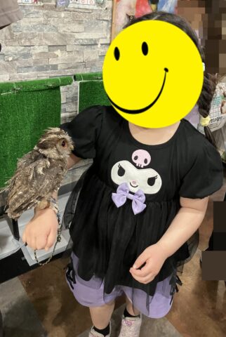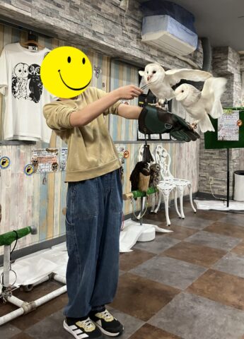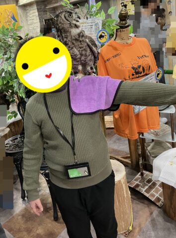 フクロウを肩や腕にのせたり、エサをあげたりとフクロウと楽しく過ごしました。